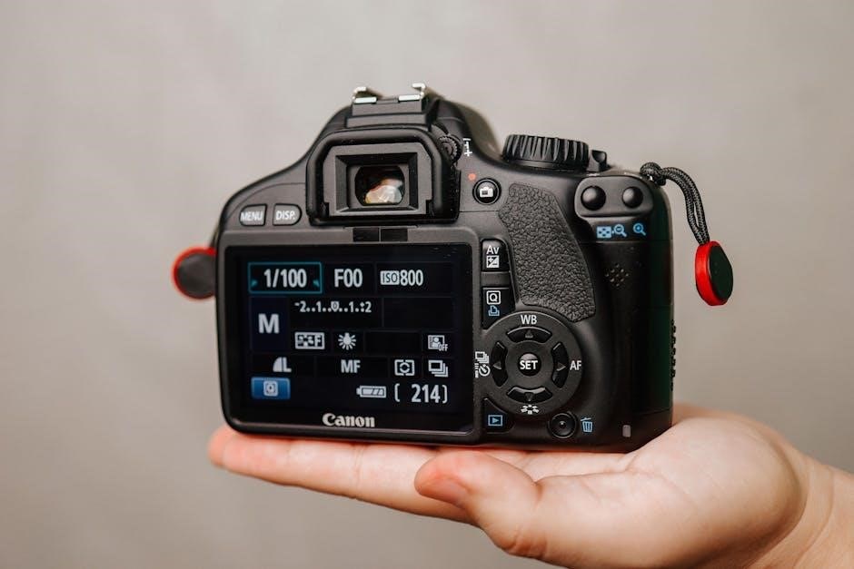 The Canon EOS 350D features an 8-megapixel CMOS sensor, delivering high-resolution images with vibrant colors and good dynamic range. It supports various file formats, including JPEG and RAW, allowing flexibility in post-processing. The camera offers an ISO range of 100-1600, with noise reduction options for cleaner images in low-light conditions. The sensor’s performance ensures sharp details and accurate color reproduction, making it suitable for both casual and professional photography needs.